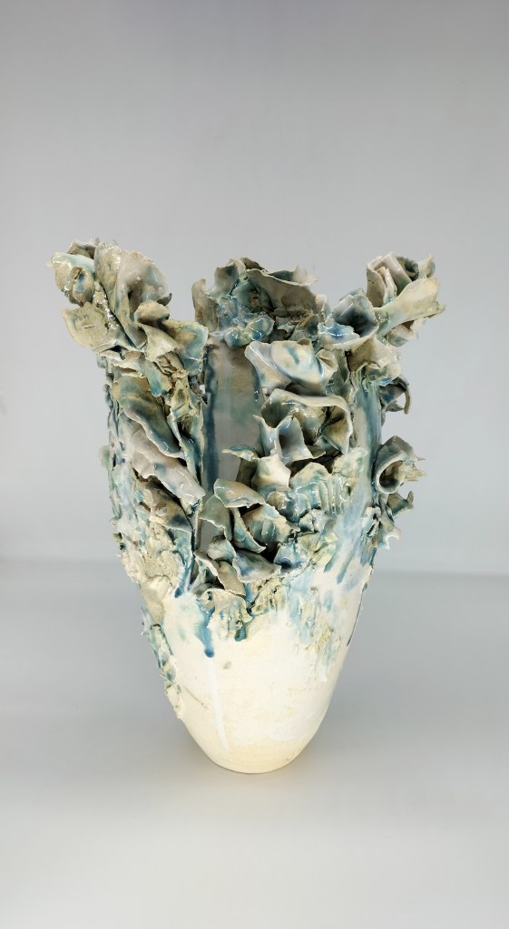 Working with locally sourced clay from St. Agnes, Mary throws and turns the initial vessel base shape on a wheel. The piece is then dried to a specific state, cut into, and altered; at this point, thin clay ribbons and texture are added to create a sense of movement, which is evident in her work. It can take weeks for the pieces to be completed before more time is taken to thoroughly dry them before they are fired twice in an electric kiln.
